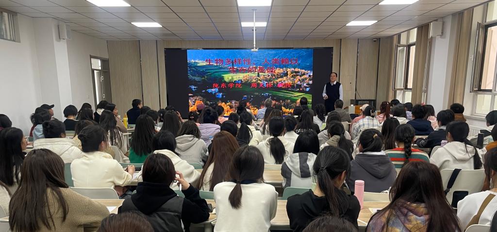 報告會上,周天林教授圍繞生物多樣性研究的重要意義、生物多樣性的價值以及隴東地區(qū)生物多樣性資源保護和利用等方面做了報告,倡導師生共同參與到生物多樣性保護的行動中來,從我做起、人人參與,讓保護環(huán)境、保護生物多樣性成為師生的行動自覺。同時,他分享了自己帶領團隊克服各種難以想象的困難,堅持從事教學科研工作和生物資源保護利用研究,取得了豐碩的成果,引導同學們要做一個心中有理想,腳下有力量的人。這既是一場精彩的學術(shù)報告,更是一堂生動的思政課。