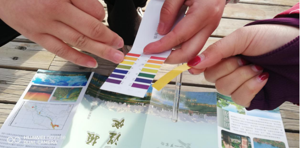 在張掖城市濕地博物館,大家通過標本、影像、幻影成像等高科技技術(shù),近距離感受和了解了張掖眾多珍稀瀕危鳥種,切身感受到了保護濕地環(huán)境的重要性。參觀結(jié)束后,黨員結(jié)合專業(yè)知識,對黑河水取樣,用試紙法檢測了水的PH,并將其帶回實驗室做進一步的檢驗,為以后的課題研究打下基礎(chǔ)。